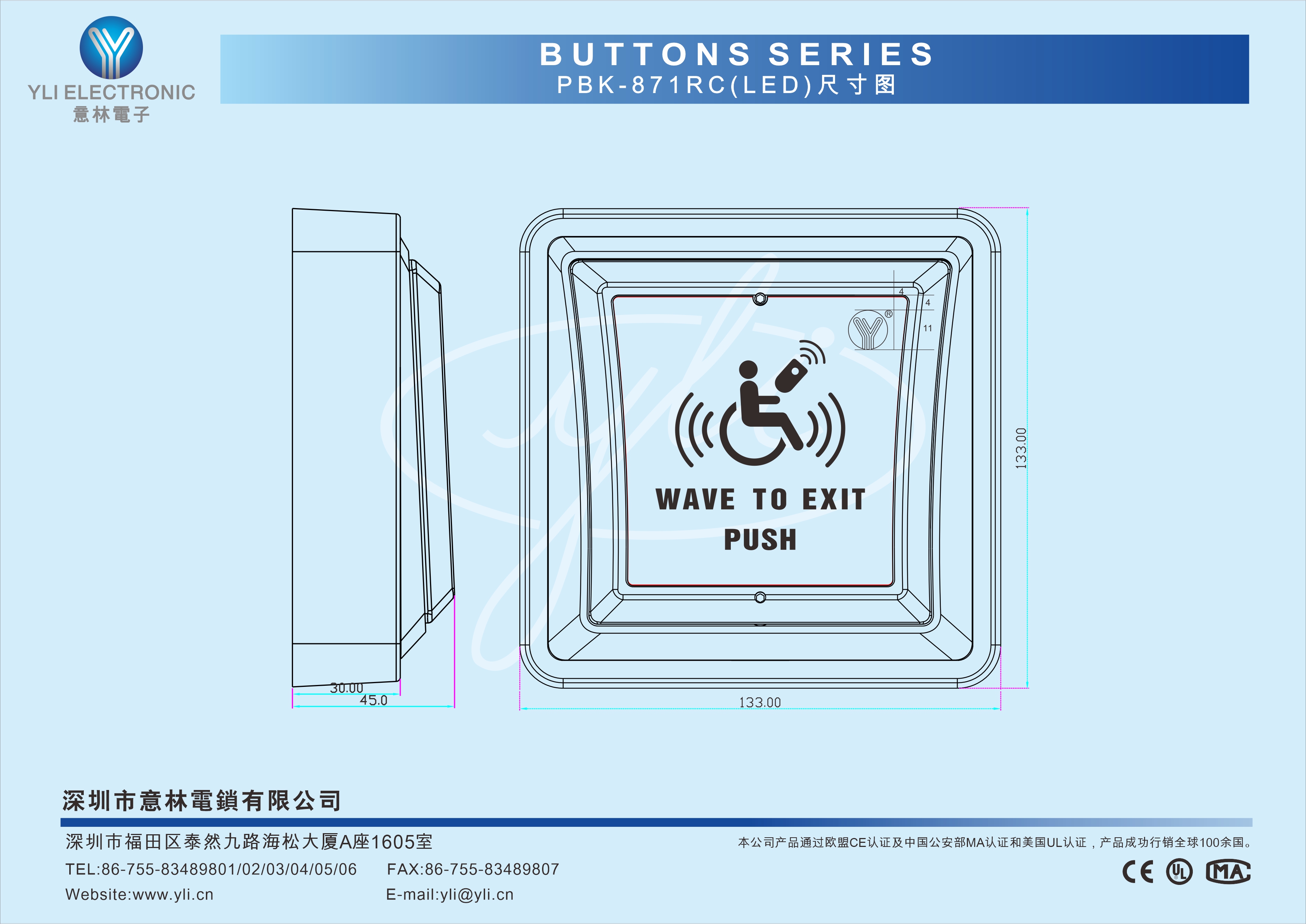 | 接点输出 | 感应:NO/NC/COM; 按压:NO/COM 遥控 |
